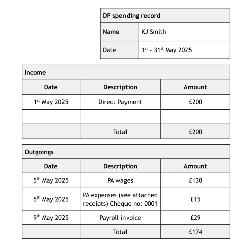 A spending record allows you to record all the money coming into and going out of your DP account- ‘income’ and ‘expenditure’. Your DP bank or prepaid card statement will provide details of incoming and outgoing payments. You should also keep invoices and receipts to evidence how the money has been spent. Your spending records may look something like this: